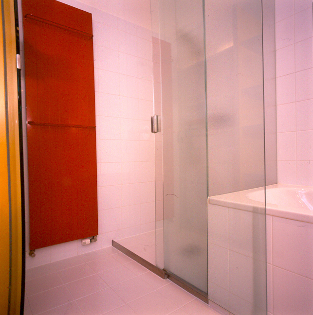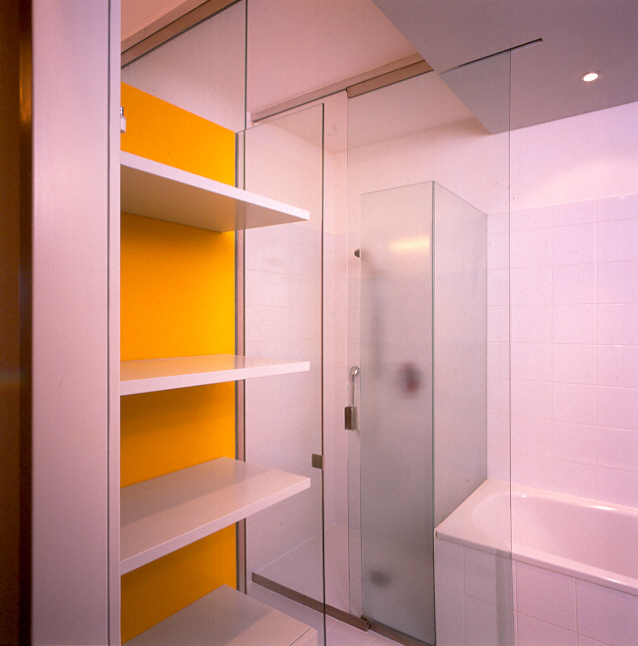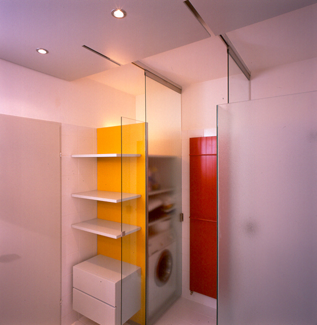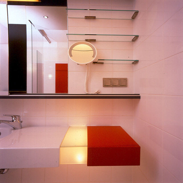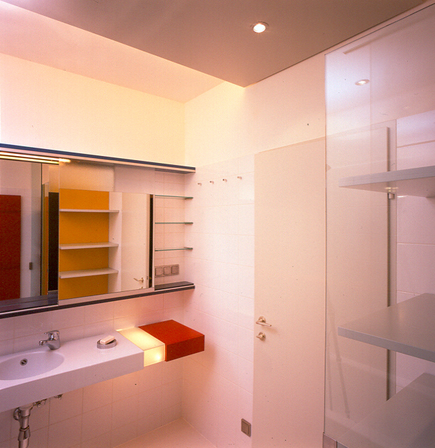 Ein Waschmaschinenblock und eine Duschkabine bilden die volumsbezogene Kontraposition zu einer Glas- und Spiegelwand des Waschtischbereiches, in welchen ein -make up- platz mit Front- und Unterlicht eingearbeitet ist.