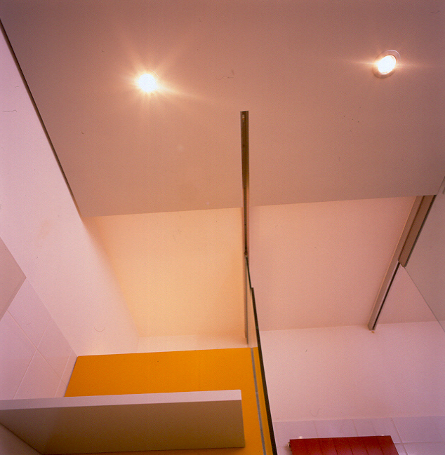 Die Öffnung der Zimmer erfolgte durch Substituierung der Ziegelwände zu verschiebbaren, sich kreuzenden Glaswänden verschiedener Transparenz und durch kompaktes individualisiertes Möblieren mit veränderbaren multifunktionalen Raumobjekten.
