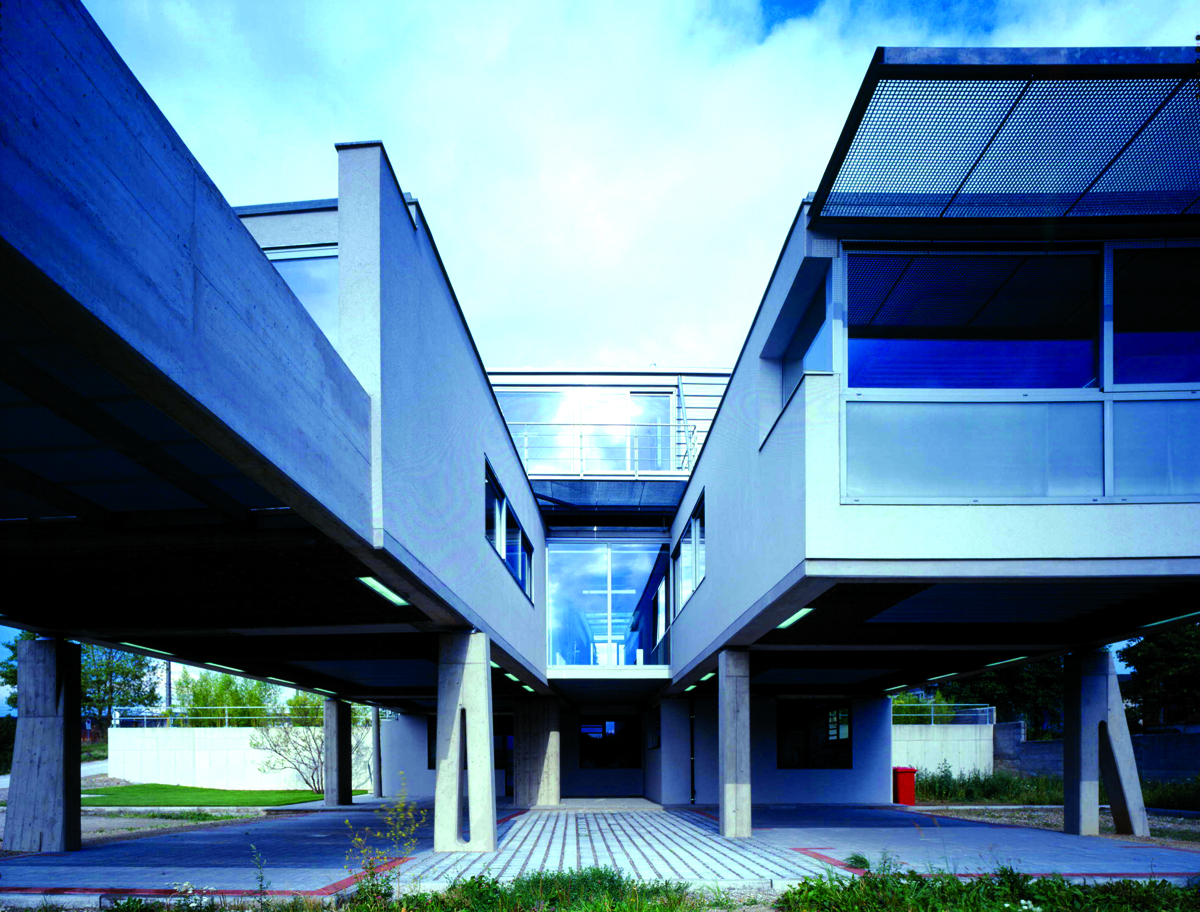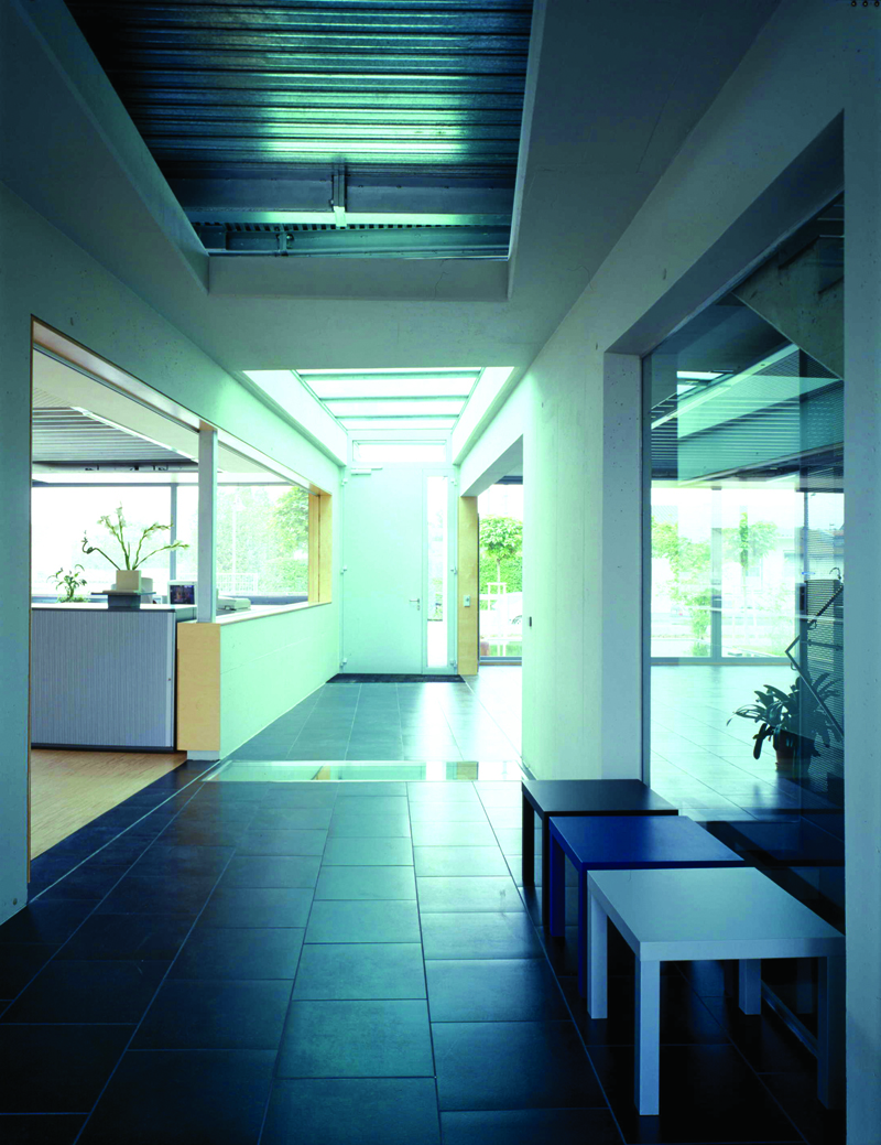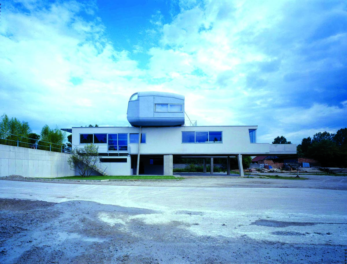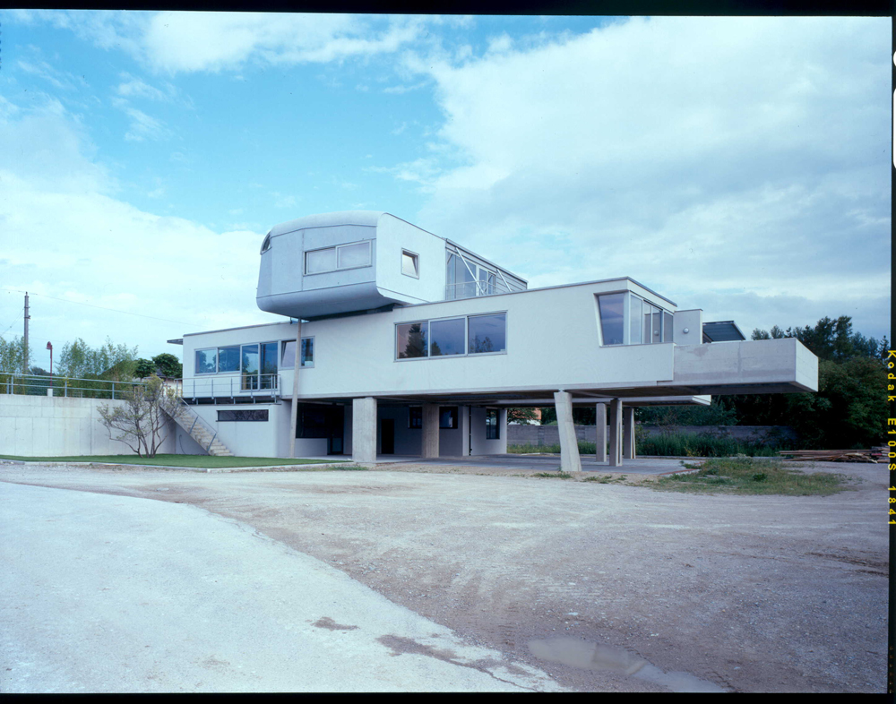 In einer Schottergrube neben dem Bahnhof hat die Firma seit langem ihr Baustofflager und Baracken für die Belegschaft. Der Baumeister ist auch Architekt, hat in der ländlichen Umgebung viel zu tun, doch besteht wenig Nachfrage nach Architektur. Für den Neubau des Firmensitzes holte er Sam als Entwerfer. Ausgeführt von den eigenen Bauleuten, entstand so an der Peripherie der Kleinstadt über dem Arsenal des Alltäglichen ein Manifest des Möglichen. Sam stapelte drei Zonen übereinander: Belegschaftsräume/Archiv bilden den kompakten Sockel in der Böschung; die Büros darüber strahlen vom Strassenniveau als räumliche Kragbalken weit in die ‘Grube’ des Geländes hinaus, überdachen auch den Vorplatz der Sockelzone; quer zu den nach Westen aufgespreizten Büros ist als Abschluss und Referenz an das Firmenlogo das Cockpit-Studio aufgesetzt. Die drei Zonen sind durch Konstruktion, Material und Lichtschneisen scharf differenziert, zugleich durch vertikal übergreifende Bewegungsräume und ‘innere Fenster’ intensiv verbunden. Sämtliche Bauteile sind statisch/plastisch durchgearbeitet, für Gewichtsersparnis und optische Leichtigkeit auf ihre Essenz getrimmt (ausgehöhlte Zugzonen der Betondecken u.a.), und diese Optimierung ist auch gestalthaft zur Sprache gebracht, wie etwa im subtilen Tanz der sechs verschiedenen Beton-Stützen unter der als Durchlaufträger konzipierten Hauptebene.