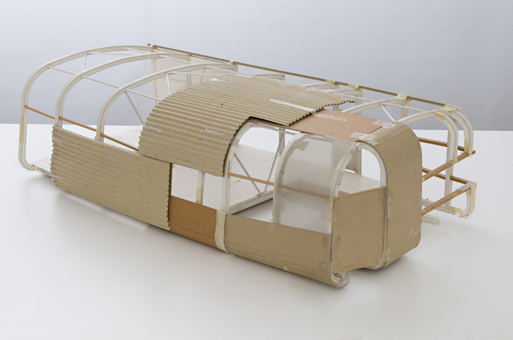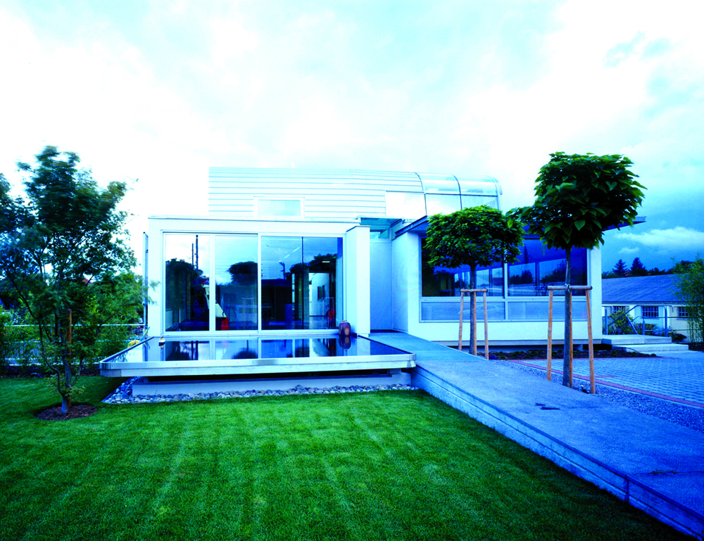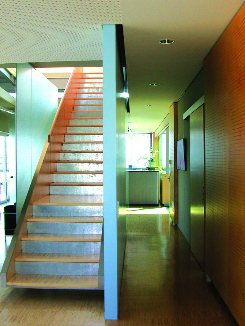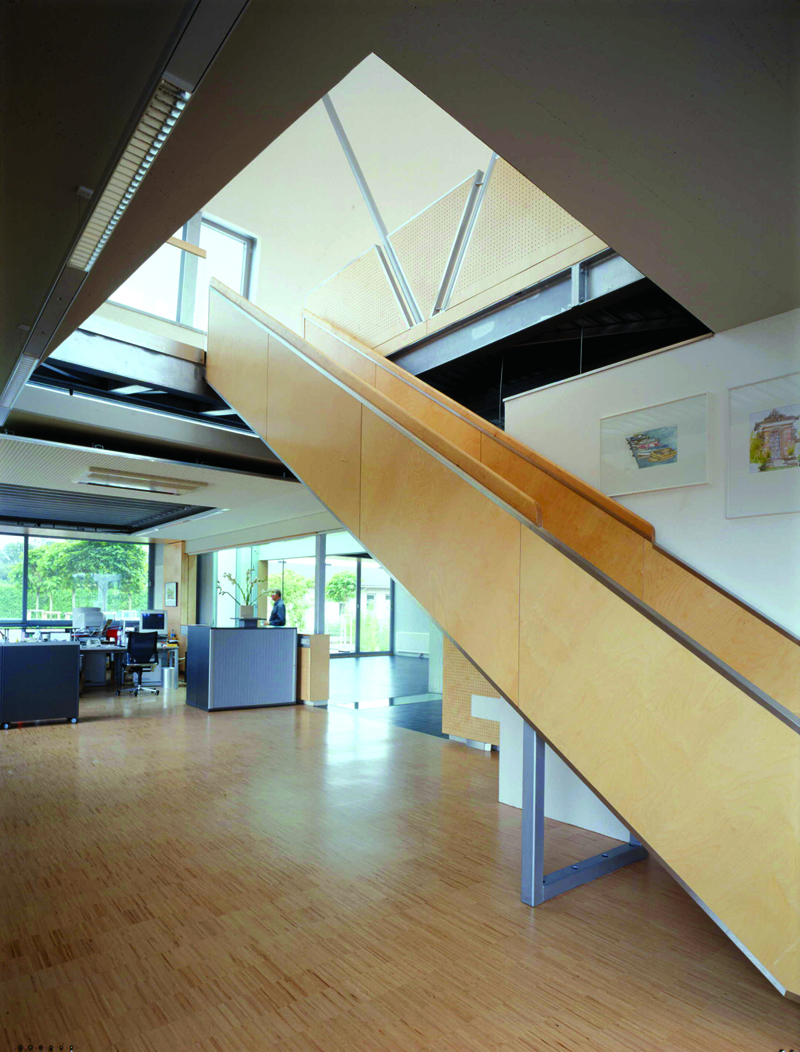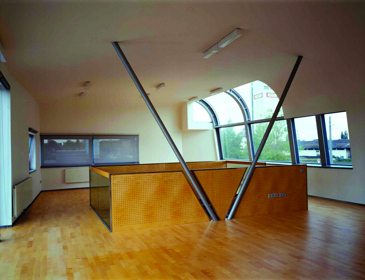 In einer Schottergrube neben dem Bahnhof hat die Firma seit langem ihr Baustofflager und Baracken für die Belegschaft. Der Baumeister ist auch Architekt, hat in der ländlichen Umgebung viel zu tun, doch besteht wenig Nachfrage nach Architektur. Für den Neubau des Firmensitzes holte er Sam als Entwerfer. Ausgeführt von den eigenen Bauleuten, entstand so an der Peripherie der Kleinstadt über dem Arsenal des Alltäglichen ein Manifest des Möglichen. Sam stapelte drei Zonen übereinander: Belegschaftsräume/Archiv bilden den kompakten Sockel in der Böschung; die Büros darüber strahlen vom Strassenniveau als räumliche Kragbalken weit in die ‘Grube’ des Geländes hinaus, überdachen auch den Vorplatz der Sockelzone; quer zu den nach Westen aufgespreizten Büros ist als Abschluss und Referenz an das Firmenlogo das Cockpit-Studio aufgesetzt. Die drei Zonen sind durch Konstruktion, Material und Lichtschneisen scharf differenziert, zugleich durch vertikal übergreifende Bewegungsräume und ‘innere Fenster’ intensiv verbunden. Sämtliche Bauteile sind statisch/plastisch durchgearbeitet, für Gewichtsersparnis und optische Leichtigkeit auf ihre Essenz getrimmt (ausgehöhlte Zugzonen der Betondecken u.a.), und diese Optimierung ist auch gestalthaft zur Sprache gebracht, wie etwa im subtilen Tanz der sechs verschiedenen Beton-Stützen unter der als Durchlaufträger konzipierten Hauptebene.