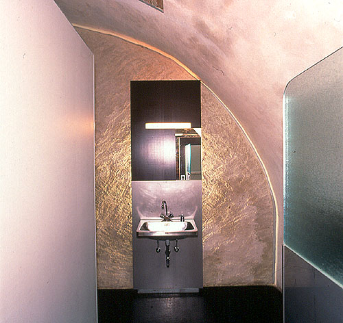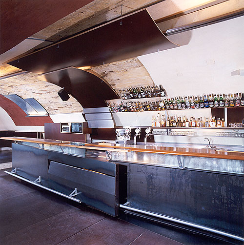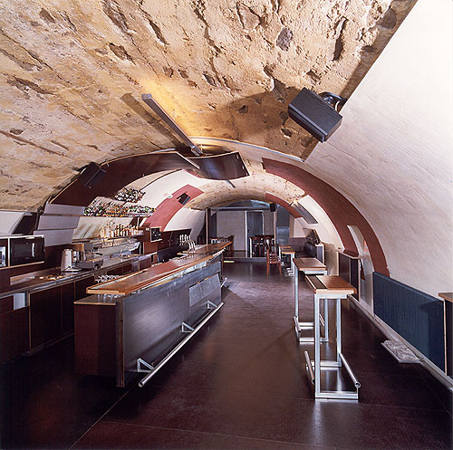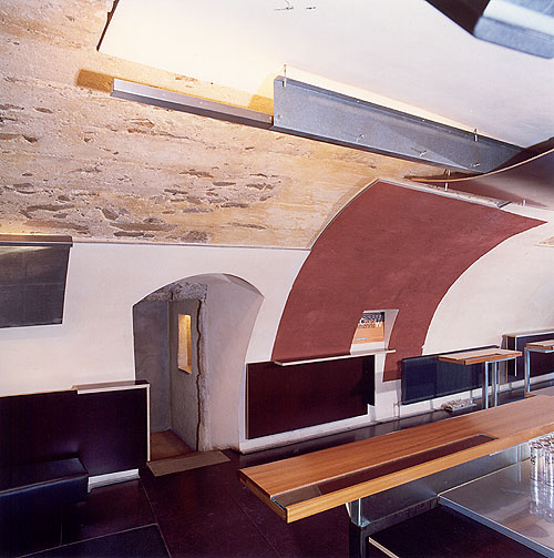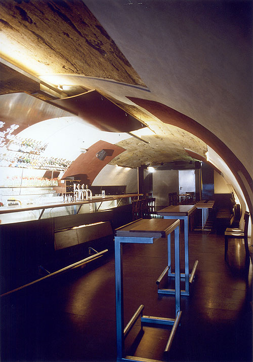 Bereits beim Betreten des Lokals, das zur Straße hin durch eine große Glaswand abgetrennt ist, macht sich das raffinierte Wechselspiel von Transparenz und Geborgenheit des höhlenartigen 18 m langen Tonnengewölbes bemerkbar: unüberwindbar scheinende Gegensätze verschmelzen hier zu einer Einheit.