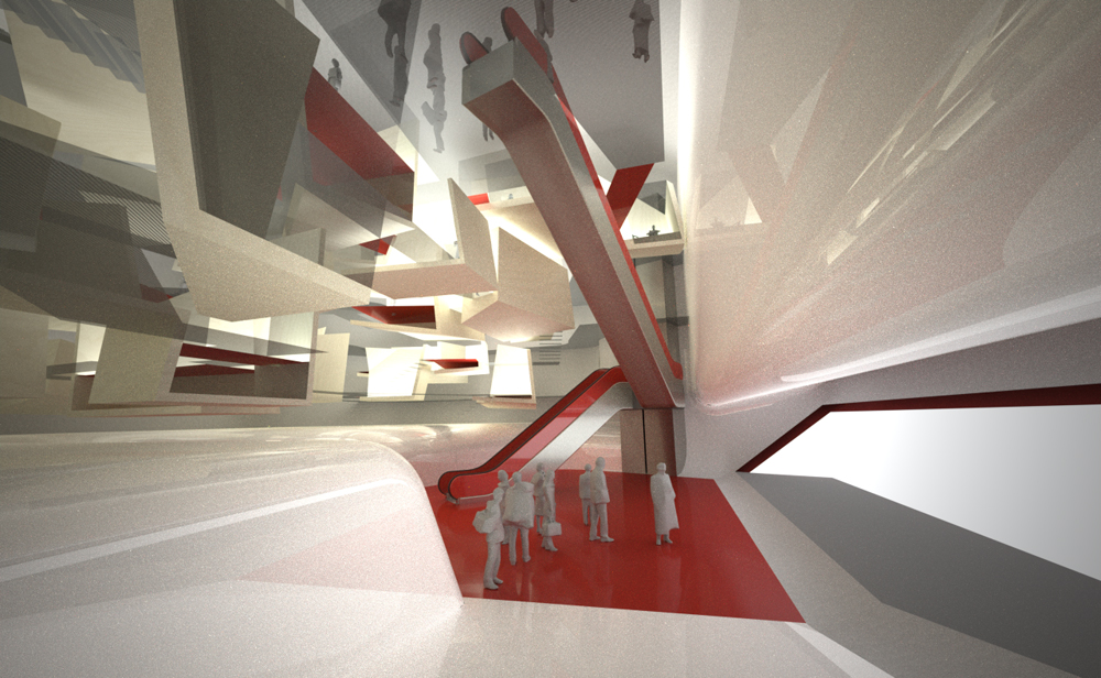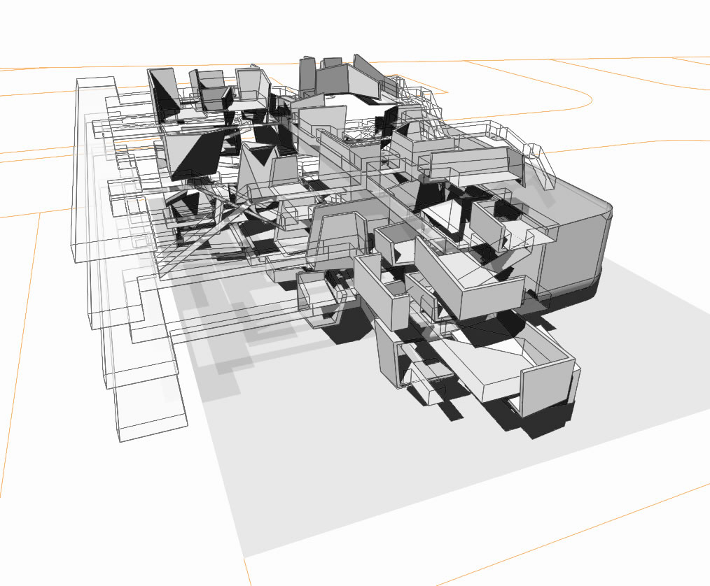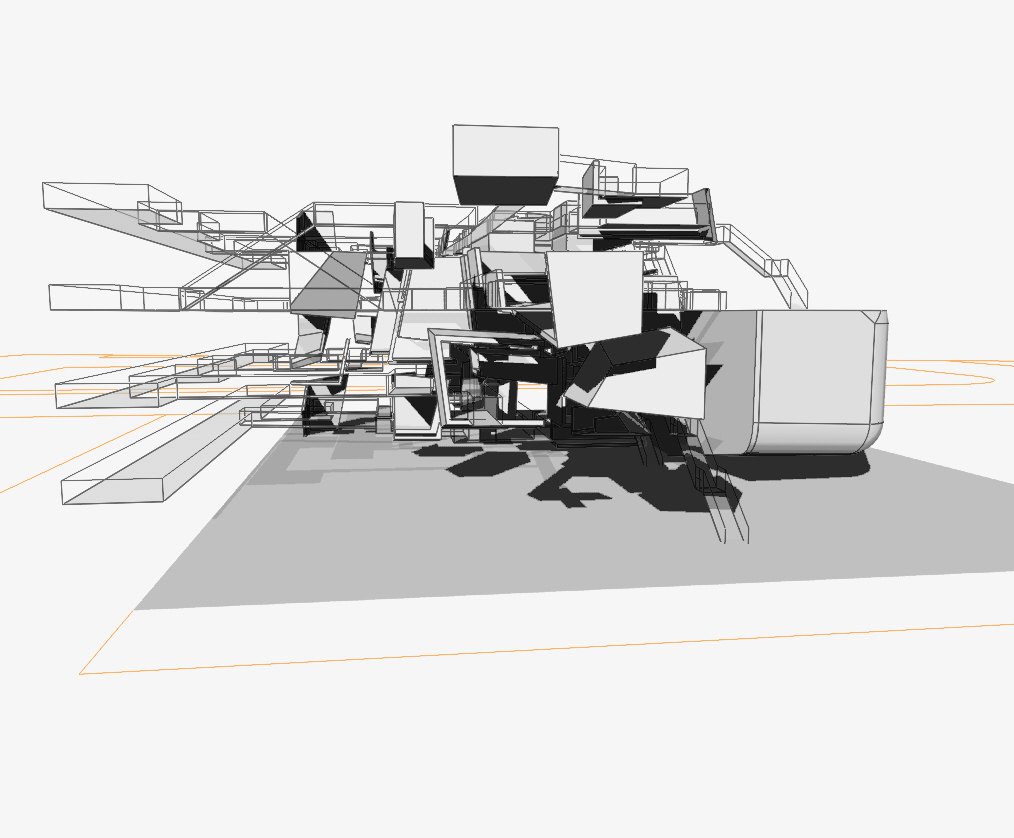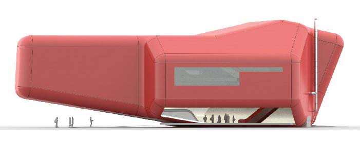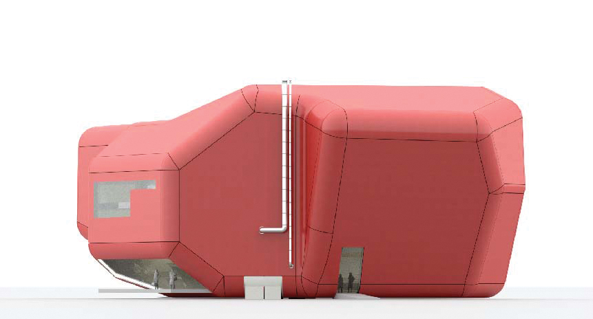 Da dieses Objekt auch einem Muikinstrumentenkoffer ähnelte, war die Symbiose aus Österreich, Musik, und Zufall fürs erste hergestellt, danach wurde das Objekt so lange zurechtgefeilt, bis es in etwa die richtige Kubatur hatte. Im nächsten Durchgang wurden in das Hüllenobjekt nun die 64 Stationen hineingepackt und durch Stegerschließungsebenen sowie Stiegen, Rolltreppen und Aufzüge verbunden.