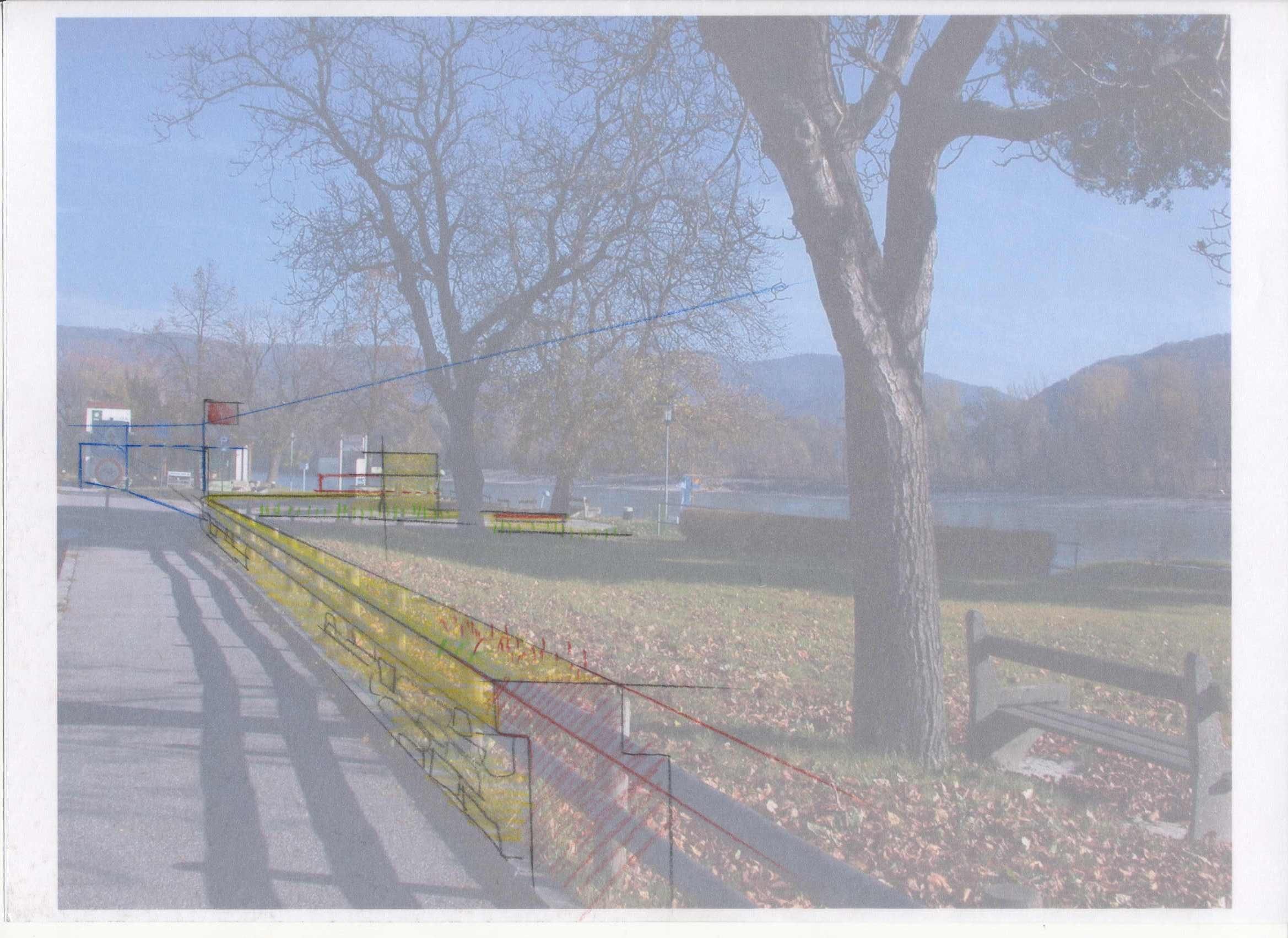 Der zentrale Ansatz der Summe der Gestaltungsmassnahmen ist einerseits das Herausarbeiten einzelner kleinräumiger Bereiche zur Darstellung der Bedeutung der Gesamtmassnahmen des Hochwasserschutzes als stationäre Wandelemente, welche wiederum in einem mehrfach funktionellen und ortsräumlichen Nutzungsbezug stehen. Die Entwicklung von Akzeptanz gegenüber der Summe der Masse der notwendigen baulichen Hochwasserschutzmassnahmen wird dadurch gefördert und als allgegenwärtige räumlich formale Selbstverständlichkeit wahrgenommen. Der Beginn und das Ende der Wandanlagen zählt dabei ebenso dazu, wie die Gestaltung von Übergangs- und Vermittlungsbereichen funktionaler Art. Gestaltete Kleinobjekte stellen dabei das Anfangs- oder Endstück dar.