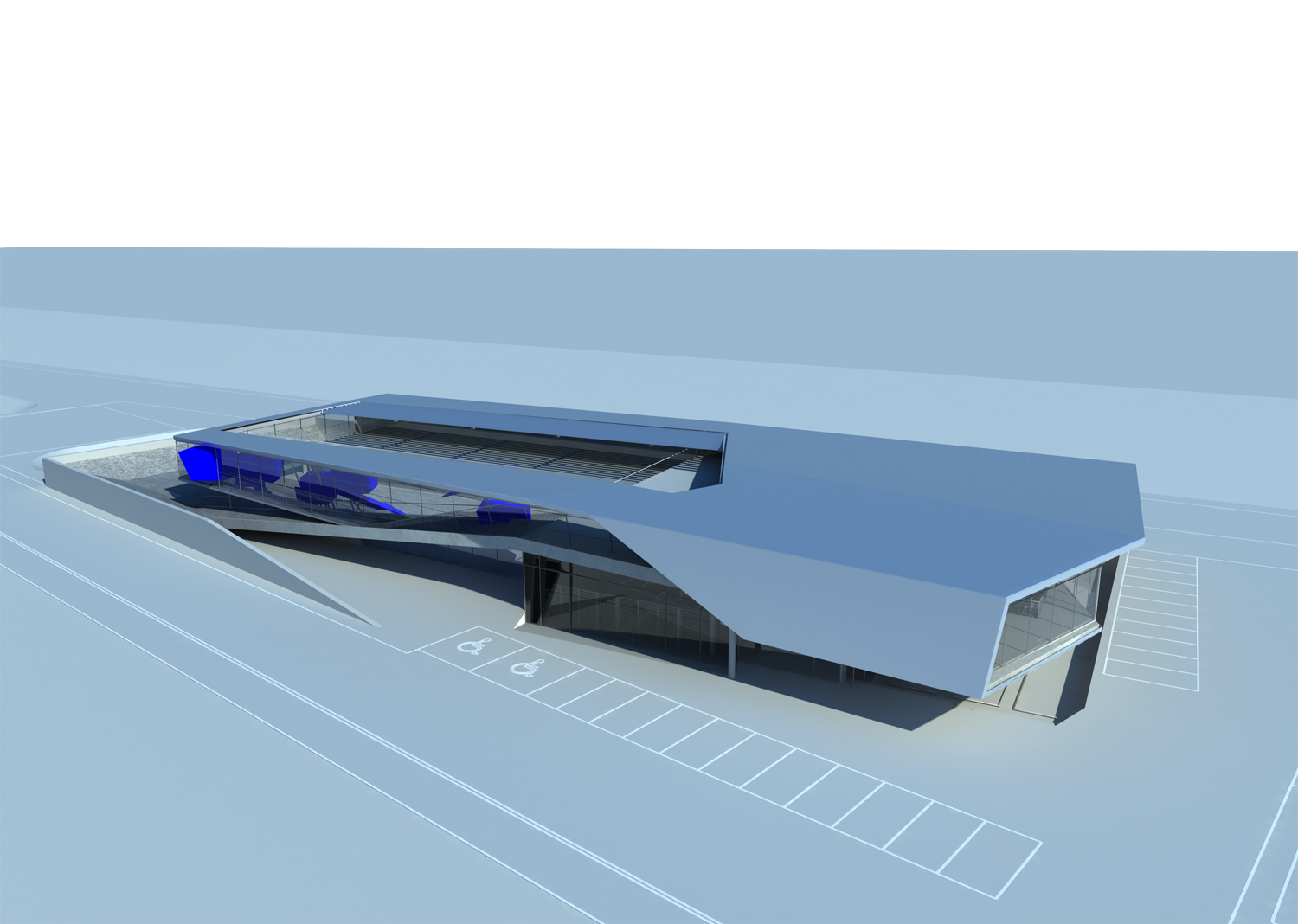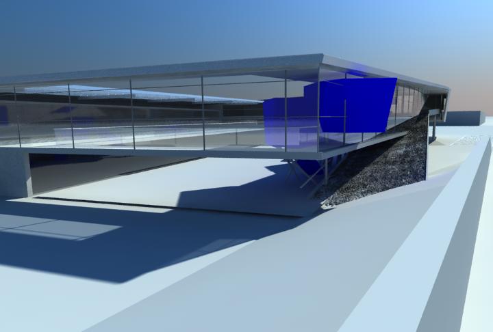 Um bestmögliche schallschutztechnische Abschirmung besonders auch der Freibereiche zu erreichen, werden Sportklub und Kindergarten in einem kompakten Baukörper zusammengefasst, der hohe innere räumliche Differenzierung mit einem zeichenhaften Erscheinungsbild nach außen kombiniert.