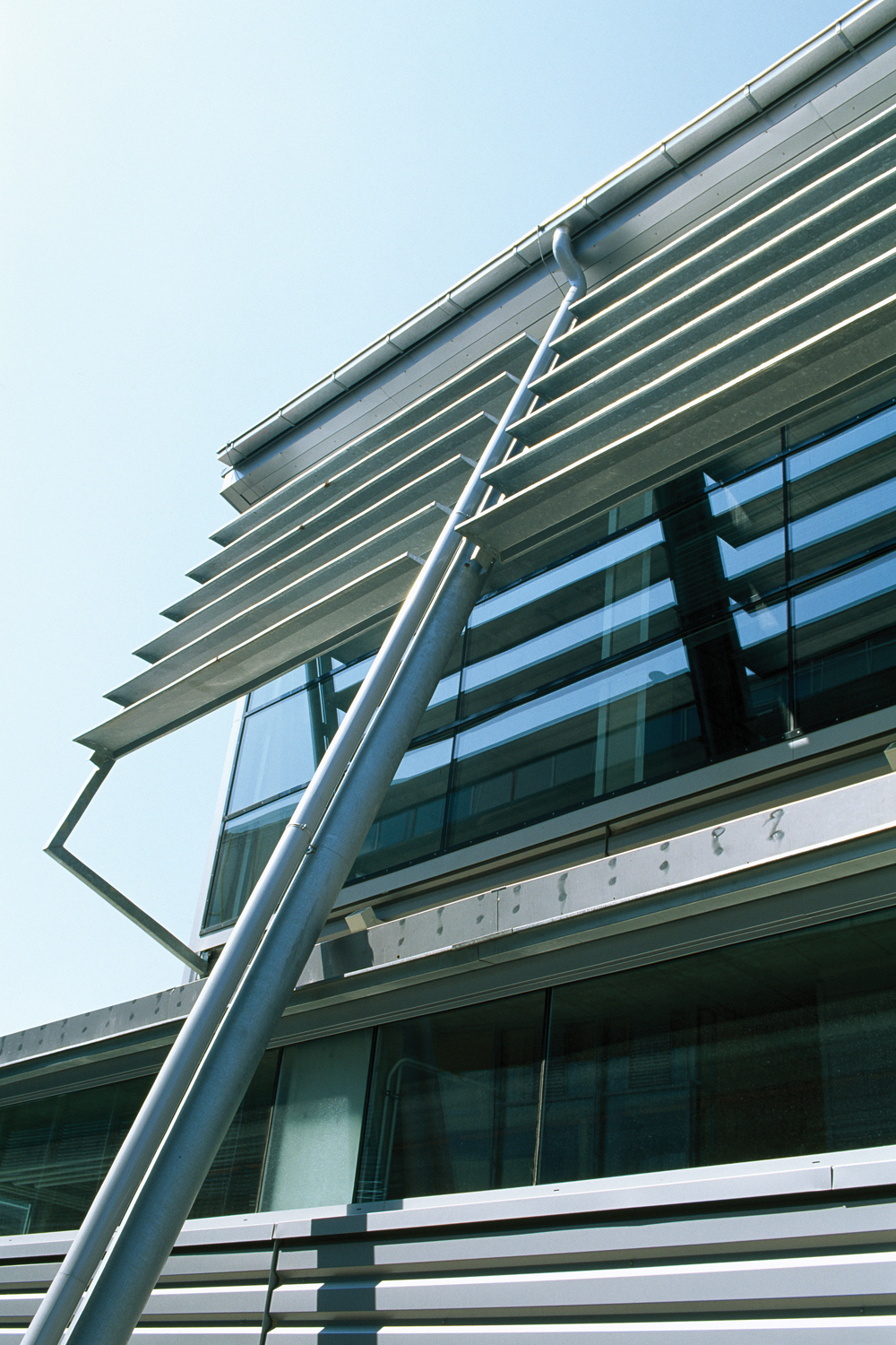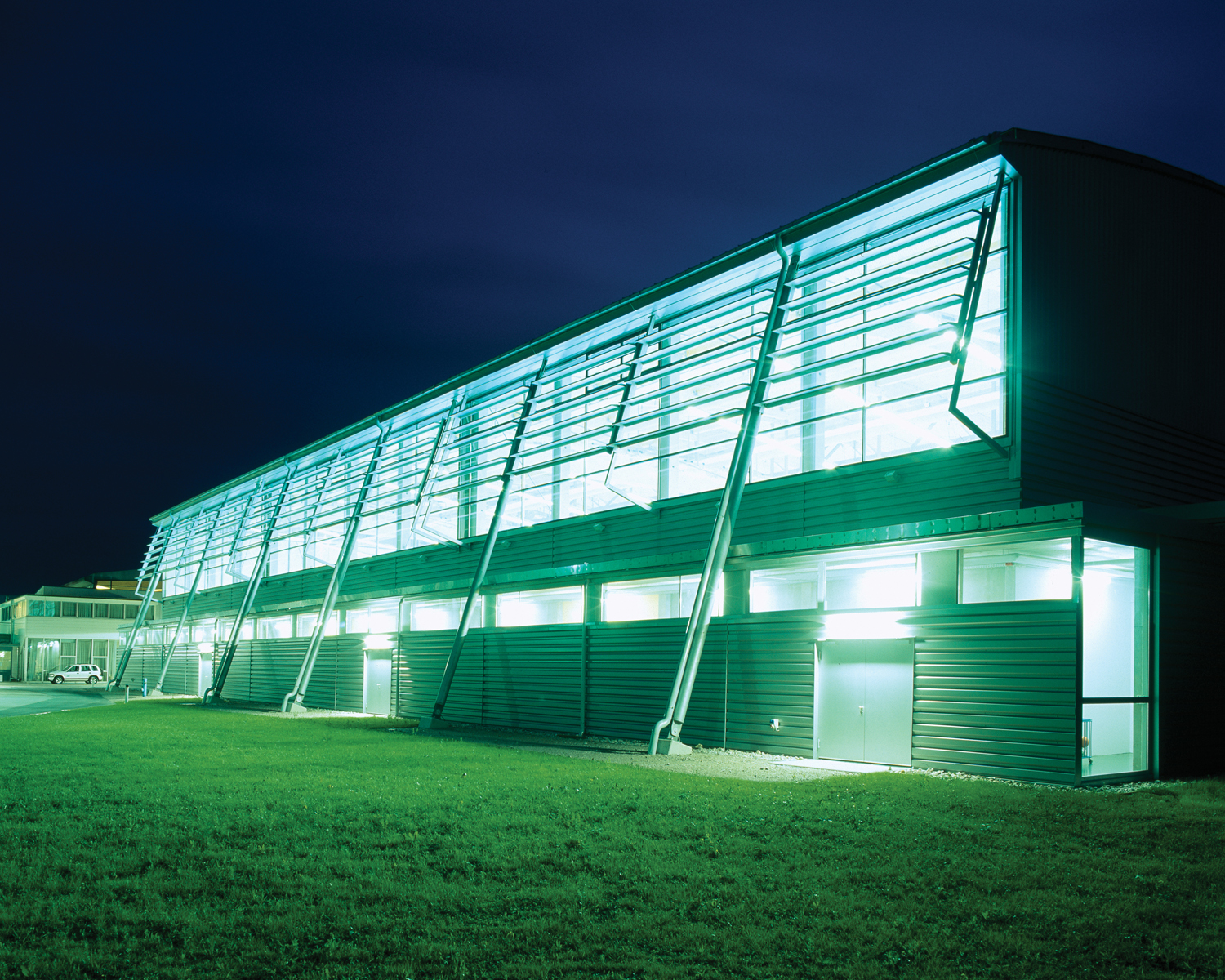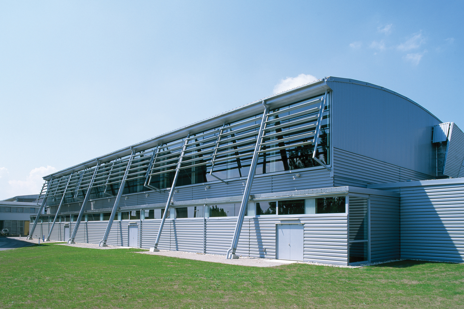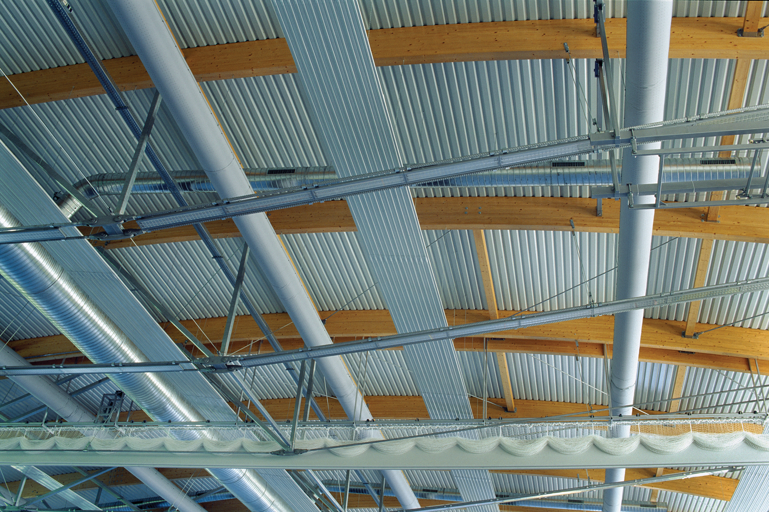 Das Lichtraumprofil über dem gesamten Hallenfeld beträgt 9m, die gesamte Halle erreicht eine Höhe von etwa 13m. Die Hallenkonstruktion besteht aus Fertigteilstützen mit einem unterspannten bogenförmigen Dachtragwerk aus Holzleimbindern und einer Abspannung aus Schrägstützen (Ostseite). Die Halleninnenwände wurde durch teilweise gelochte farbige und graue Oberflächen einerseits architektonisch interessant gestaltet und andererseits wirksam akustisch schalldämmend ausgeführt. Die Aussenerscheinung der Halle stellt sich als hinterlüftete Blechfassade dar, welche durch Verkippen von Teillflächen gegeneinander untergliedert wird. Geometrisch gestaltete Wetterschutzflügel über den seitlich angeordneten Lageranbauten, auf denen die Lüftungsgeräte aufgestellt sind, sollen einen zusätzlichen architektonischen Akzent setzen.