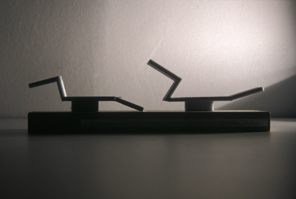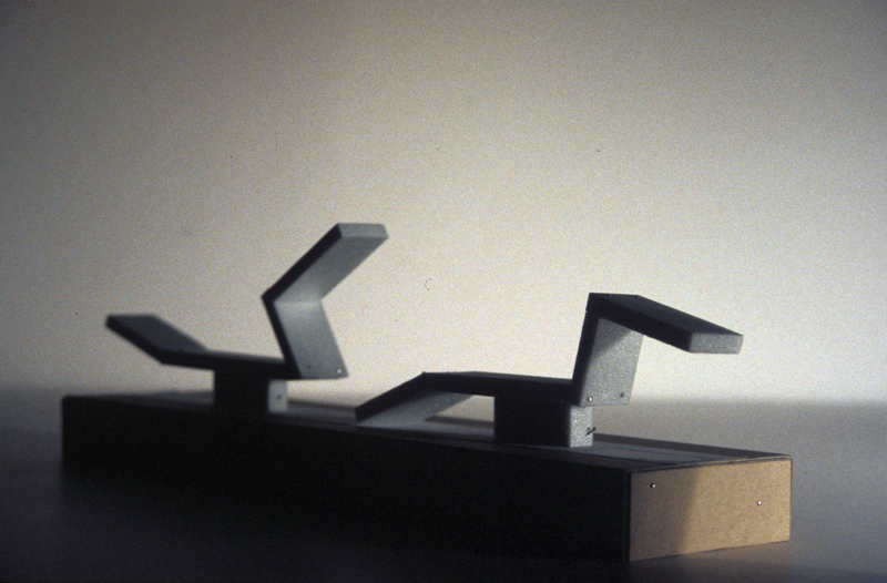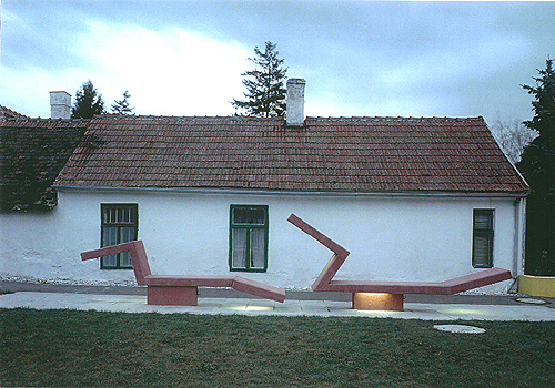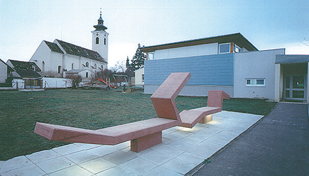 Als zeitgemäßes Gegenstück zum (renovierten) Mosaikbild der Volksschule entstand ein zweckorientiertes Objekt im Bereich des Turnsaalzuganges der neu renovierten und umgebauten Volksschule, wobei Maßstäblichkeit und Freisichtigkeit den längsorientierten Zugang begleiten. Dieses im Übergangsbereich zwischen Turnwiese und Hauptzugang zum Turnsaal mehrfach nutzbare, plastisch gestaltete Objekt bildet einen gleitenden Übergang zur Rasenfläche. Die unterlegte Plattenfläche (helle Betonplatten) dient der Reflexion des Lichtes und untertags als zusätzliche Spielfläche für die Kinder. Das Objekt ist als gefärbtes Betonfertigteil so ausgebildet, daß durch eingearbeitete Lichtquellen eine Beleuchtung des Zugangweges wie des Objektes selbst erfolgt. Eine Nutzung der Betonplastik als Sitzgelegenheit im Nahbereich der Turnwiese ist beabsichtigt und wünschenswert. Das Objekt wird von den Kindern bereits als Spielobjekt benützt. Als Material für das Objekt wurden rot gefärbte Sichtbetonteile vorgesehen, deren Oberfläche schalrein belassen wurde. Die Kanten wurden abgefast. Die Lampenkörper sind revisionsfähige Einbauteile mit Glasabdeckungen, die in das Fertigteil integriert wurden. (Franz Sam)