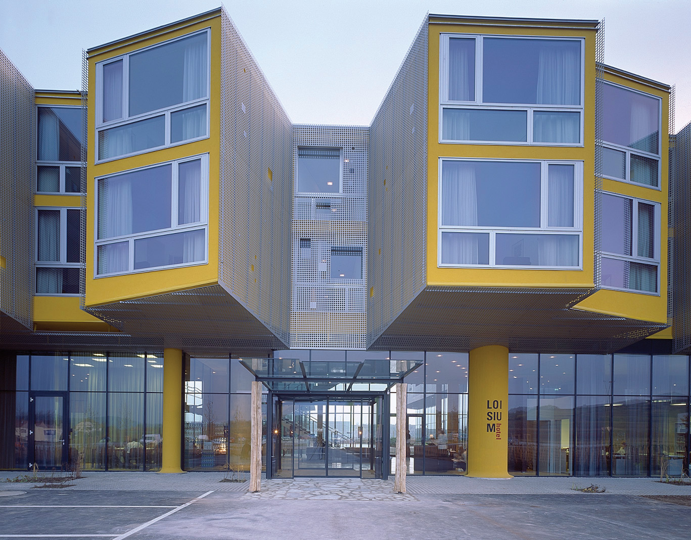 Die Vermarktung des Hotels als Haus für individuelle Gäste mit speziellen Interessen und hohen Ansprüchen ermöglichte nicht nur eine Designer-Strategie, sondern forderte sogar explizit deren Umsetzung. Neben dem Farbkonzept (Gelb für die Lobby, Rot für das Restaurant, Grün für den ausgedehnten und lustvoll durchgeformten Spa-Bereich) gehören dazu natürlich auch die individuell ausgestatteten Zimmer mit Werken verschiedenster Künstler sowie zahlreiche weitere Design-Details wie die Lichtregie in den Korridoren, die gleichzeitig rohe und elegante Aluminiumfassade, eine Bibliothek zu Kunstthemen und die Freiraumgestaltung von den Grazer Landschaftsarchitekten ko a la, die hierfür individualistische “pocket-gardens” entwarfen. Die räumliche Grundkonzeption des Hauses als offener vierseitiger Hof um einen Pool mit dem seitlich durch Glaswände einbezogenen Restaurant erfüllt viele Anforderungen des Tourismus im obersten Preissegment. Mit dem Hotel ist nicht nur räumlich, sondern auch im Kategorienspektrum der Gesamtanlage eine Vervollständigung erreicht. Denn die Erlebniswelt des Loisium ist vorwiegend für Tagestourismus konzipiert, während das Hotel weitergehenden Ansprüchen dient. Als eine von weltweit nur 20 AVEDA-Destinationen (eine internationale Marke für „the art and science of pure flower and plant essences”) bietet sein Spa-bereich entsprechende Exklusivität. Vor allem das Hotel zeigt dabei, dass eine durchdachte und anspruchsvolle künstlerische Konzeption, die aktuelle und historische Referenzen bedient, jederzeit marktfähig ist. Und dass die touristischen Betriebserfordernisse keineswegs zu Lasten der Gestaltung gehen müssen, sondern sie im Gegenteil – bei entsprechender thematischer Programmierung des Betriebs – sogar intensiv stimulieren können.