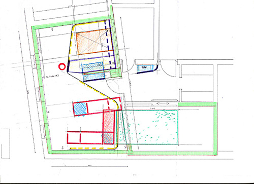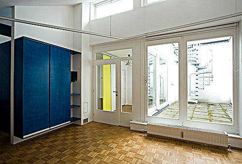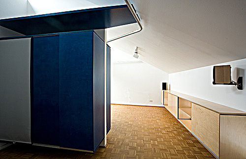 Im Bereich einer renovierten Einraum-Wohnung mit Küche und Bad war eine Ein-Personen Wohnung einzurichten. Die Erfordernisse hierfür waren soweit anspruchsvoll, als das Herausarbeiten einer klaren Konzeption für die graduelle Zonierung von Privatheit in den Bereichen Wohnen, Arbeiten und Schlafen gewünscht war. Der Bereich des Arbeitens war als Besonderheit mit der Funktion eines Fotostudios zu überformen. Diese Funktion erforderte die Verwandlung des gesamten Ein-Raumes in ein sachlich farbneutral gestaltetes Raumgebilde mit entsprechenden Oberflächen und der Möglichkeit, großformatige Fotohintergründe anzubringen. Die zentrale Entwurfsidee war das Einbringen einer mehrfach gekrümmten, den Raum erfassenden Trageschiene, welche, als Funktionsträger von parallel laufenden Vorhängen und Leinwänden, den Raum teilt und funktionsbezogen strukturiert. Auf diese Weise entstehen ein abtrennbarer Schlafbereich, Möglichkeiten zur Zonierung des Arbeitsbreiches und das Befestigen von neutralen Fotohintergründen als Studiowände. Die Möblierung des Raumes erfolgte einerseits durch ortsfeste, an der Wand montierte, rucksackartige Kastenelemente, welche die Sicht auf Decke und Boden freihalten, wie auch durch leicht gehaltene, auf Rollen positionierte Möbelstücke von Tisch und Regal. Die Möbel selbst sind als dünnwandige Elemente mit einem Tragegestell aus Stahlformrohren konzipiert wobei Schiebetüren bei den ortsfesten Elementen und Screen Rollos bei den Mobilien den Volumsabschluss bilden.