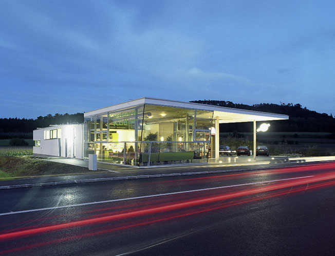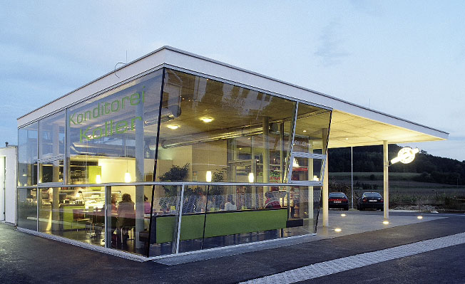 Für die ungewöhnliche Kombination dieser drei Berufe entwickelten Franz Sam und Irene Ott-Reinisch ein noch ungewöhnlicheres Multiobjekt, das einem Roadmovie entsprungen zu sein scheint und wenn man vom Hügel hinunter ins neue Siedlungsgebiet am Stadtrand Paudorfs fährt als überraschender, städtebaulich streng positionierter Attraktor auftaucht. Das radikal ungewohnte Gebilde zieht die Blicke der stark befahrenen Straße auf sich. Auf Initiative des Bauherren, des Zahnarztes Manschiebel, erfolgte die konzeptuelle Zusammenführung der verschiedenen Professionen. Das eingeschossige Gebilde enthält rechterhand die Zahnarztpraxis, linkerhand die Cafekonditorei und in der Mitte, wie ein Keil hineingeschoben, die Tabaktrafik. Unter dem Vordach können die Autofahrer direkt an die Zigarettentankstation heranfahren. Nach hinten verjüngt sich die Trichterform und enthält die vier parallel angeordneten Ordinationsräume der Zahnarztpraxis. Der Wunsch nach introvertierter Zurückhaltung führte zu einem Oberlichtband, das sich in das Büro des Zahnarztes als Unterlichtband zieht und auf 70 cm Höhe Einblicke auf Schuhwerk und Beine freigibt. Bestimmend für die nüchtern, schlichten Praxisräume sind die drei Materialien Beton, Gipskarton und Glas. Schwarzer Gußasphaltboden kontrastiert mit den weißen Wänden und dem grünen Glas. Der Konditor hat in aneignender Verwendung den Sichtbeton mit Rosenstoff umwickelt.