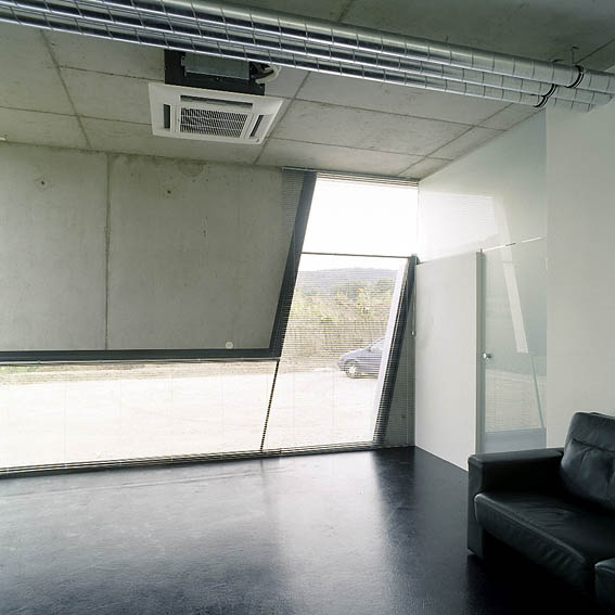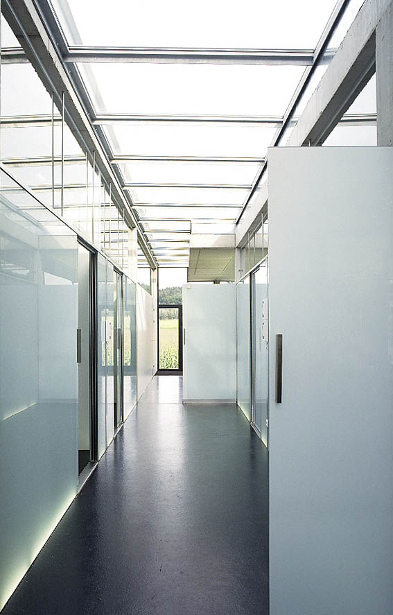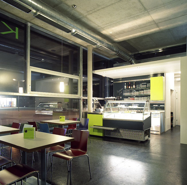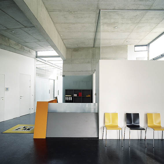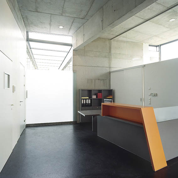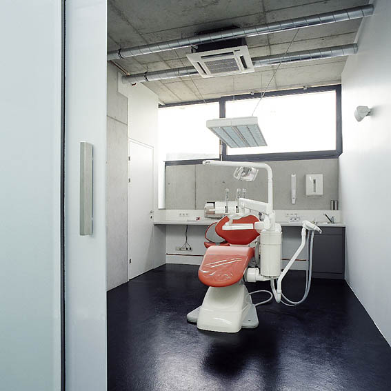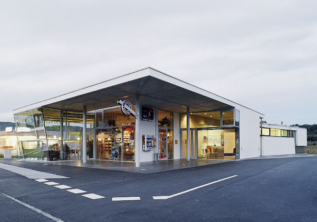 In Paudorf entstand mitten im Ort und dennoch auf der grünen Wiese ein neues Zentrum, welches durch die Einrichtungen und neuen Bedürfnisse der Konsum-Gesellschaft in ländlichen Raum bestimmt ist. Das Raumprogramm des eingeschossigen Neubaues schien auf den ersten Blick sehr ungewöhnlich: Neben der bereits eingesessenen, vorher in einem Geschoßwohnbau untergebrachten Zahnarztpraxis sollte auch ein kleines Cafe und eine Tabaktrafik unterkommen. Unter einem auskragenden – alles unter einen Hut bringenden – Vordach befinden sich die Eingänge zu allen drei „locations“, neben dem ebenfalls neuen Supermarkt und dem Gemeindehaus sollte dieser Eingangsbereich einen Art Drehpunkt darstellen. Im Sommer soll ein Gastgarten diesen Bereich noch mehr betonen. Das Sehen und Gesehenwerden ist zwar ein viel besprochenes Tagesthema wegen der vordergründig mangelnden Gemütlichkeit, gleichzeitig wurde das Cafe aufgrund seiner extremen Transparenz aber zu einem sofortigen vielbesuchten Ort von Einkäufern, Vorbeikommenden und –fahrenden wie auch Dorfbewohnern und Szenetreff. Die strenge und nüchterne Architekturerscheinung entspricht den Wünschen des Zahnarztes, der gleichzeitig Bauherr und Vermieter für die beiden anderen Einrichtungen ist. Es wurden wunschgemäß wenige und kontrastreiche Materialien verwendet. Im Inneren und im Bereich des Vordaches blieb der Beton sichtbar, der schwarze Boden aus Gussasphalt steht im Kontrast zu den weißgestrichenen (=zahnweißen) Trockenbauwänden und der weißen Außenerschienung. Lediglich die Logofarbe (orange) des Zahnarztes und die Logofarbe des Konditors (grün) wurden als Farbakzente verwendet. Konstruktiv besteht das Gebäude aus einem Stahlbetonscheibentragwerk mit einzelnen Stahlbetonstützen und Außenmauern aus Stahlbeton mit unter- und Oberlichten. Das auskragende Vordach wurde – um es schlanker wirken zu lassen – an den Rändern voutenförmig abgedickt.
