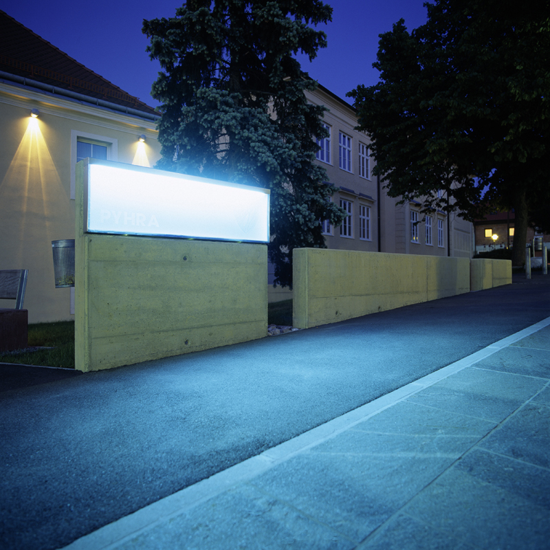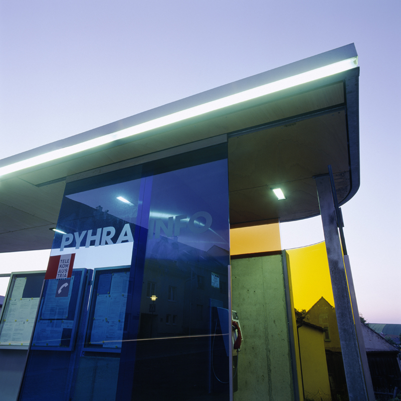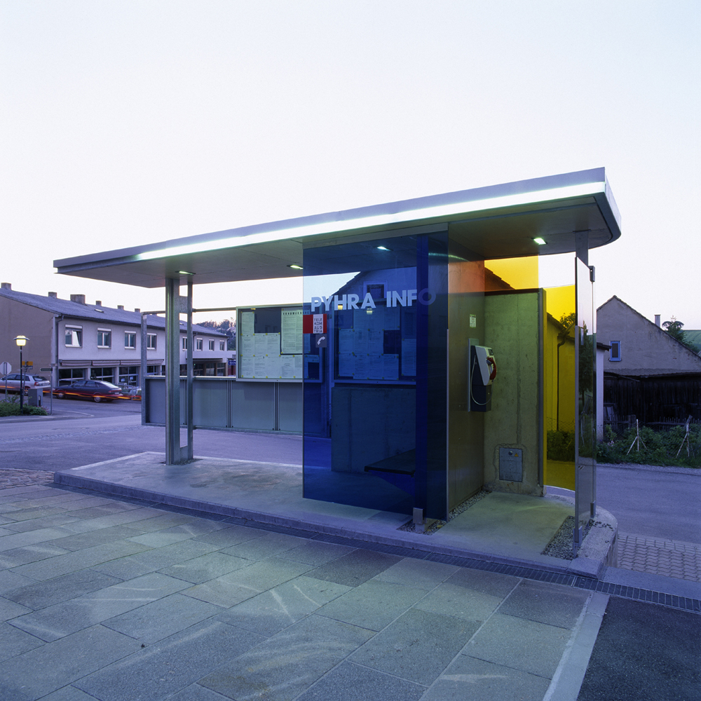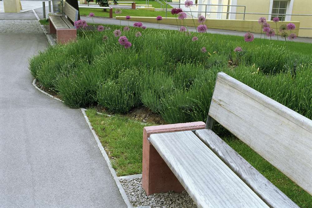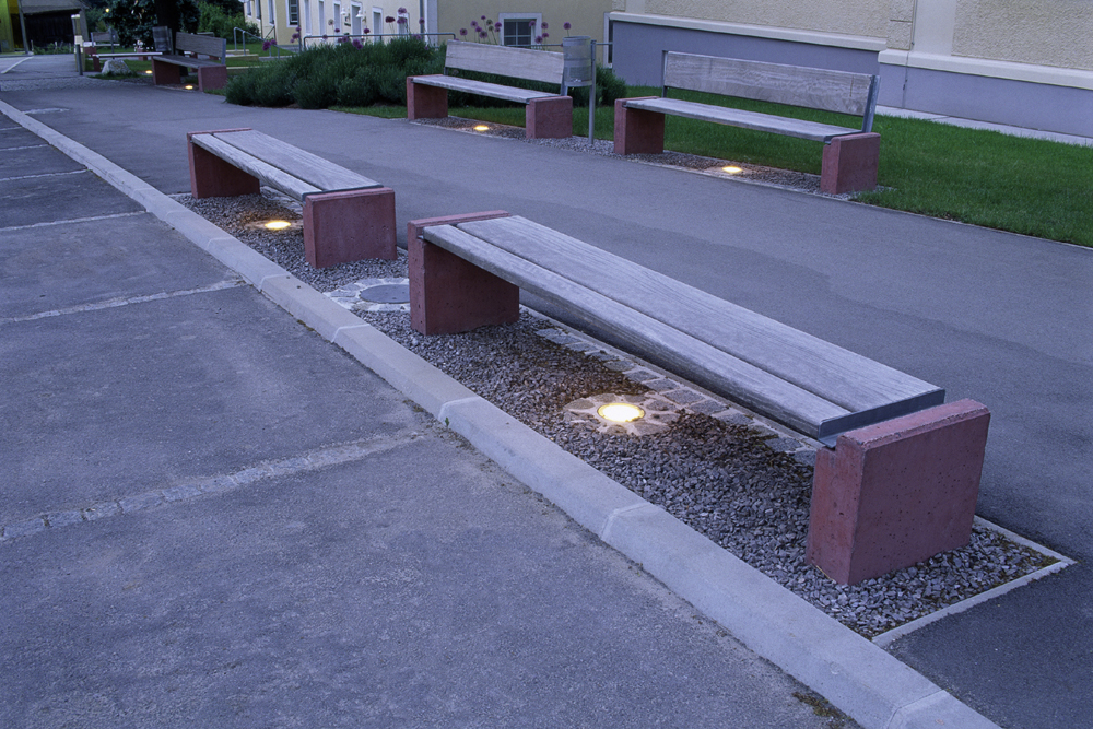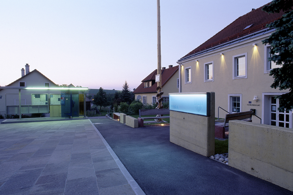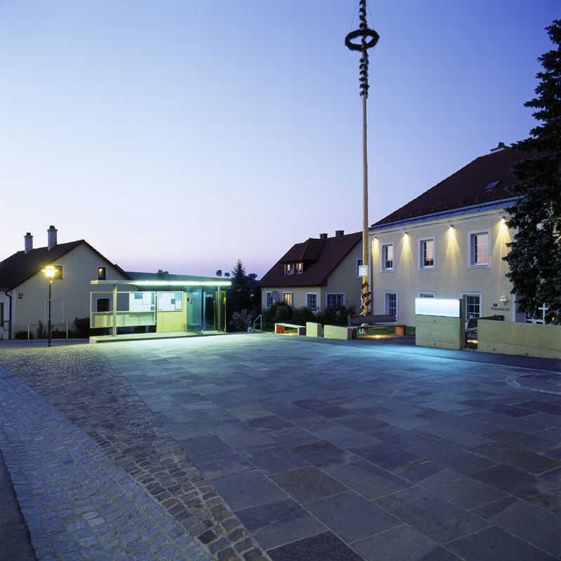 Der vom topografisch höchsten Punkt bei Raika und neuem Gemeindezentrum in Richtung Norden (Tankstelle) und Osten (Pfarrhof) fallende Platz wird neu geordnet und mit deutlicher Trennung zwischen Fussgängerwegen und Autoverkehr versehen.