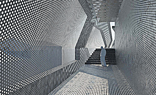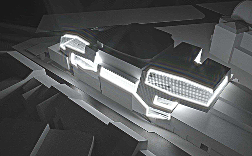 Das neue Gesamtvolumen versucht sich so dicht wie möglich an die bestehende Kubatur anzuschmiegen, bestehende Nischen zu nutzen, und eine (durch den Bühnenturm gesetzte) maximale Höhenentwicklung nicht zu überschreiten. Einschnitte berücksichtigen die Belichtung tiefer liegender Zonen und gliedern die internen Funktionen. Die Fassade wird durch transluzente und opake Flächen strukturiert, die sich in die Dachflächen hinein fortsetzten. Der Körper stellt sich dadurch als einheitliches aufgesetztes Volumen dar. Er grenzt sich vom darunterliegenden Bestand ab, stellt aber farblich eine Verbindung zur Dachlandschaft der Oper her. Durch die Spangenwirkung vor dem Bühnenturm wird ein Equilibrium hergestellt und eine – die Umstände des Bestandes berücksichtigend – proportional ausgewogene Gesamterscheinung erzielt. Die Fensterflächen treten hinter der gelochten Fassade erst in der Nacht in Erscheinung.