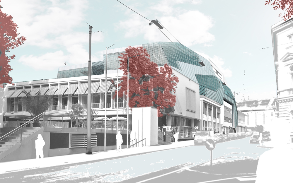 Mit dem Ziel den inhomogenen Bestand des Thalia-Komplexes einzufassen, wurden die neuen Volumen über Thalia und Montagehallen als Spange ausgebildet. Durch die einheitliche Außenhaut wird dieses zweigeteilte Volumen als Ganzes empfunden und fügt den in mehreren Bauetappen gestörten Gesamtkomplex – quasi unter einem Dach – gestalterisch wieder zusammen. Der sehr heterogene Altbestand wird nach dem Prinzip „one color“ vereinheitlicht, ohne explizit neue Fassadengestaltungen zu benötigen. Im Bereich des girardigassenseitigen „Glashütchens“ werden kleinere Eingriffe in den Bestand vorgeschlagen, das neue Volumen stülpt sich an dieser Stelle in den Bestand. Im Bereich der historischen Fassade (vis a vis der Oper) kann durch das Zurücksetzen des aufgesetzten Volumens erreicht werden, dass die denkmalgeschützte Fassade in ihrer Wirkung ungestört bleibt. Der Rückbau des bestehenden Glaskubus an der Nordseite (rechts Next Liberty) legt die Seitenfassade des Thaliatheaters wieder frei, und verschafft ihr Geltung.