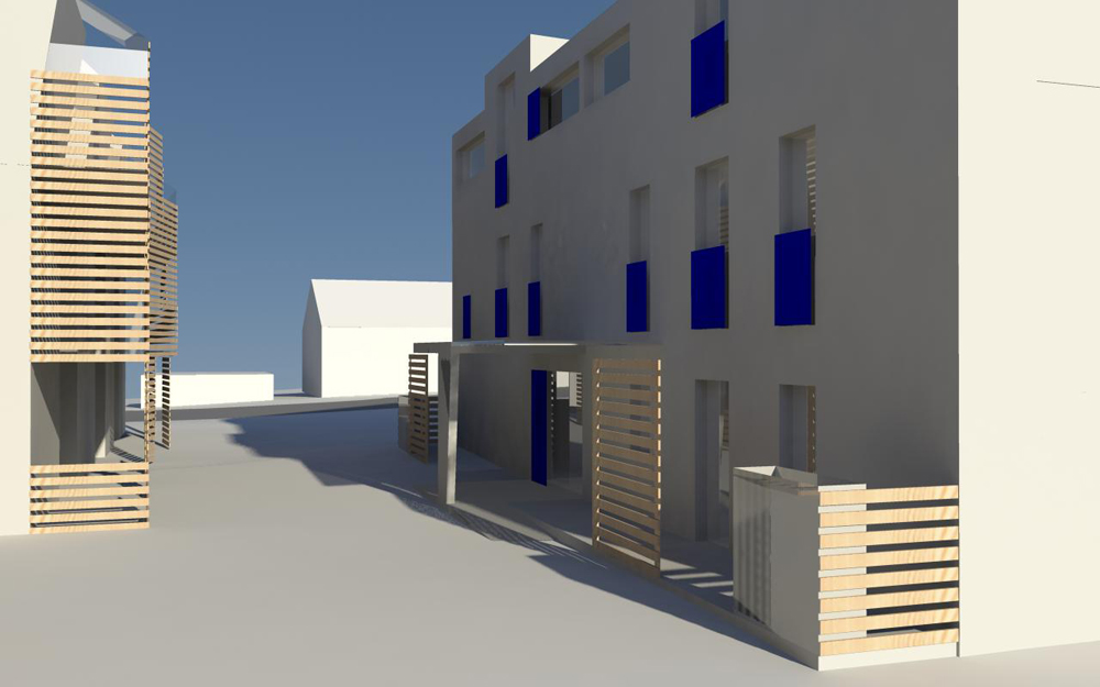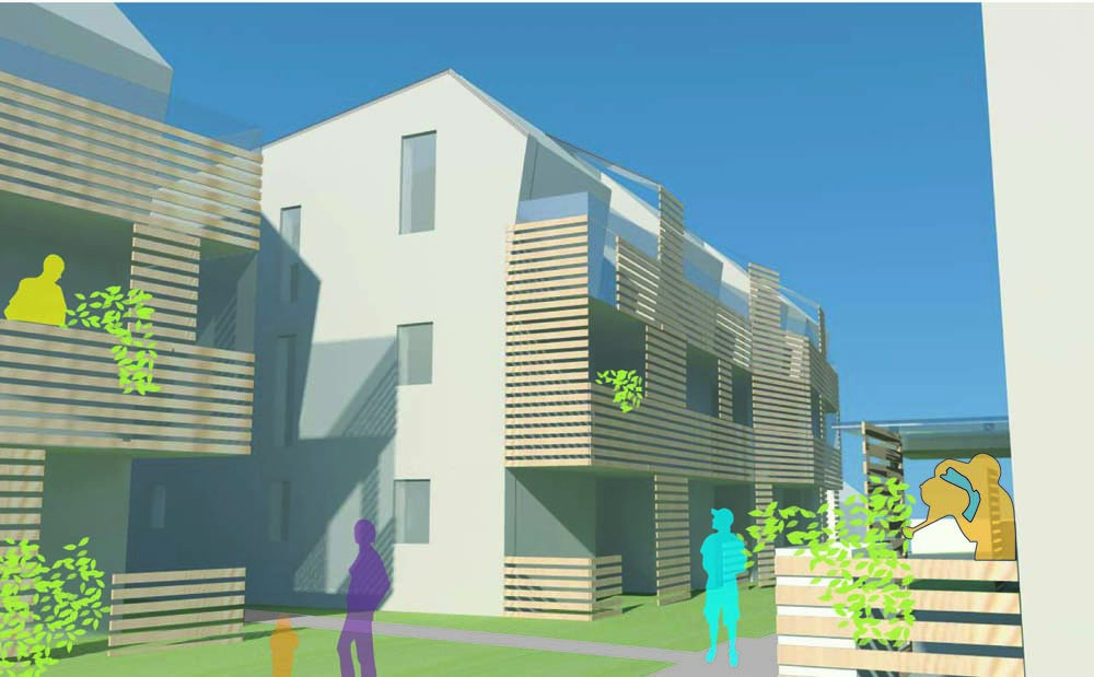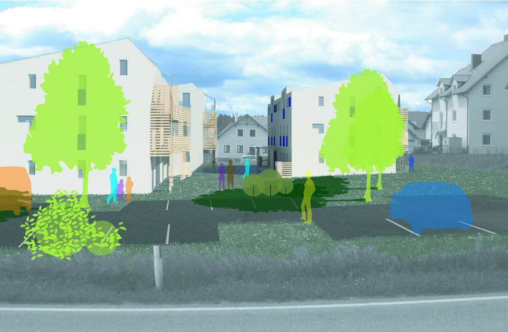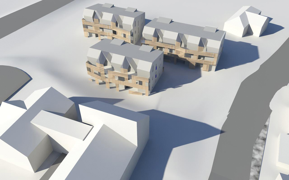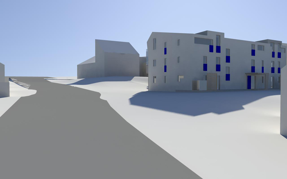 Durch die Situierung der Baukörper zueinander wird eine Beschattung der Südwestseite auch im Winter weitgehend ausgeschlossen, womit alle an der Südwestseite angeordneten Wohn- und Kinderzimmer gute solare Gewinne im Winter erzielen. Durch die Kompaktheit der einzelnen Baukörper wird sichergestellt, dass sich die Wärmeverluste durch Auskragungen und Vorsprünge – insbesondere an der Nordseite – sehr gering darstellen.